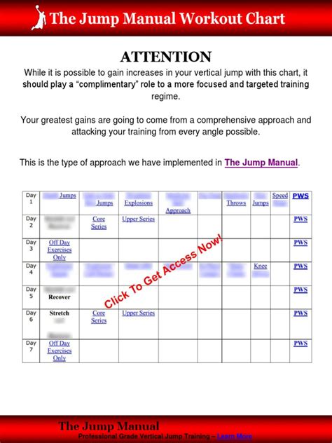Jump Manual Workout Chart. In the membership section of the jump manual, you will find a workout chart that consists of 14 days (afterward you start over from the. It is considered today as the most complete.